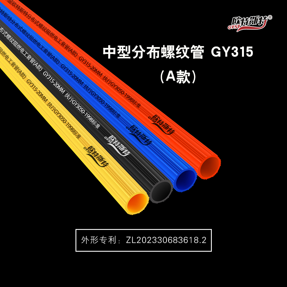 華翌歐特斯特分布式螺紋阻燃電工套管是我公司推出的一款外觀(guān)專(zhuān)利電工套管,專(zhuān)利號(hào):ZL202330683618.2,規(guī)格為GY315-18mm、GY315-20mm。顏色可定制桔色、藍(lán)色、黑色、黃色。產(chǎn)品外形特征為分布式梯形外觀(guān),六組四條縱向條紋設(shè)計(jì),每組4道加強(qiáng)筋,整體輪廓識(shí)別度高。采用進(jìn)口原料德系工藝生產(chǎn)、抗沖、耐壓、韌性好,分布紋路造型可大幅增強(qiáng)填充材料對(duì)線(xiàn)管的包裹性。杜絕空鼓現(xiàn)象。中國(guó)人保承保產(chǎn)品責(zé)任險(xiǎn)。榮選為中國(guó)3.15誠(chéng)信品牌。